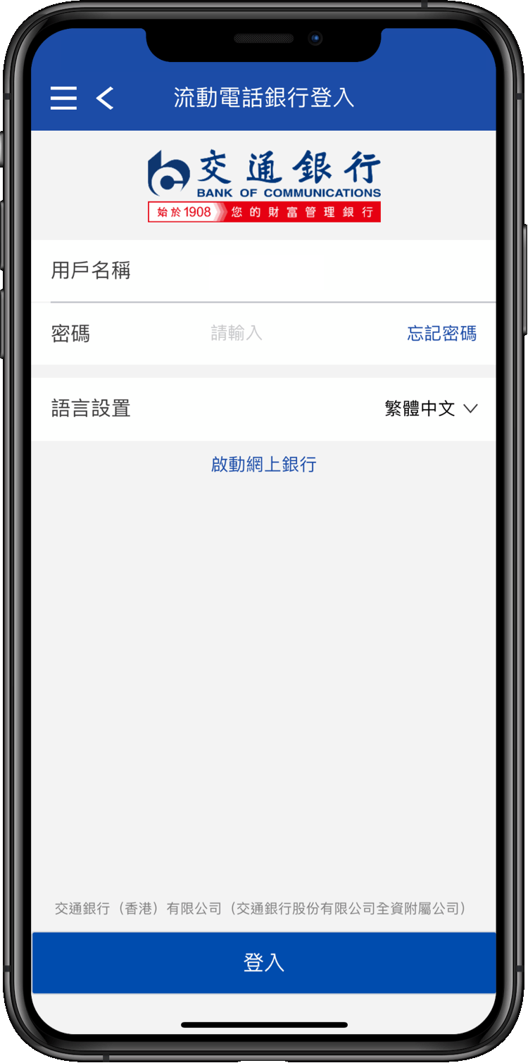 於新裝置開啟「交通銀行(香港)」手機應用程式,以用戶名稱及密碼登入。