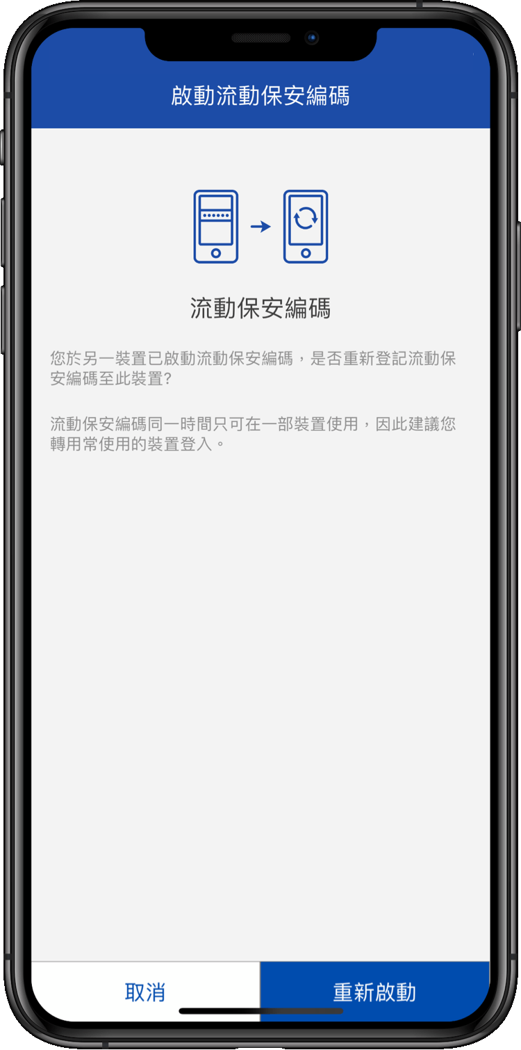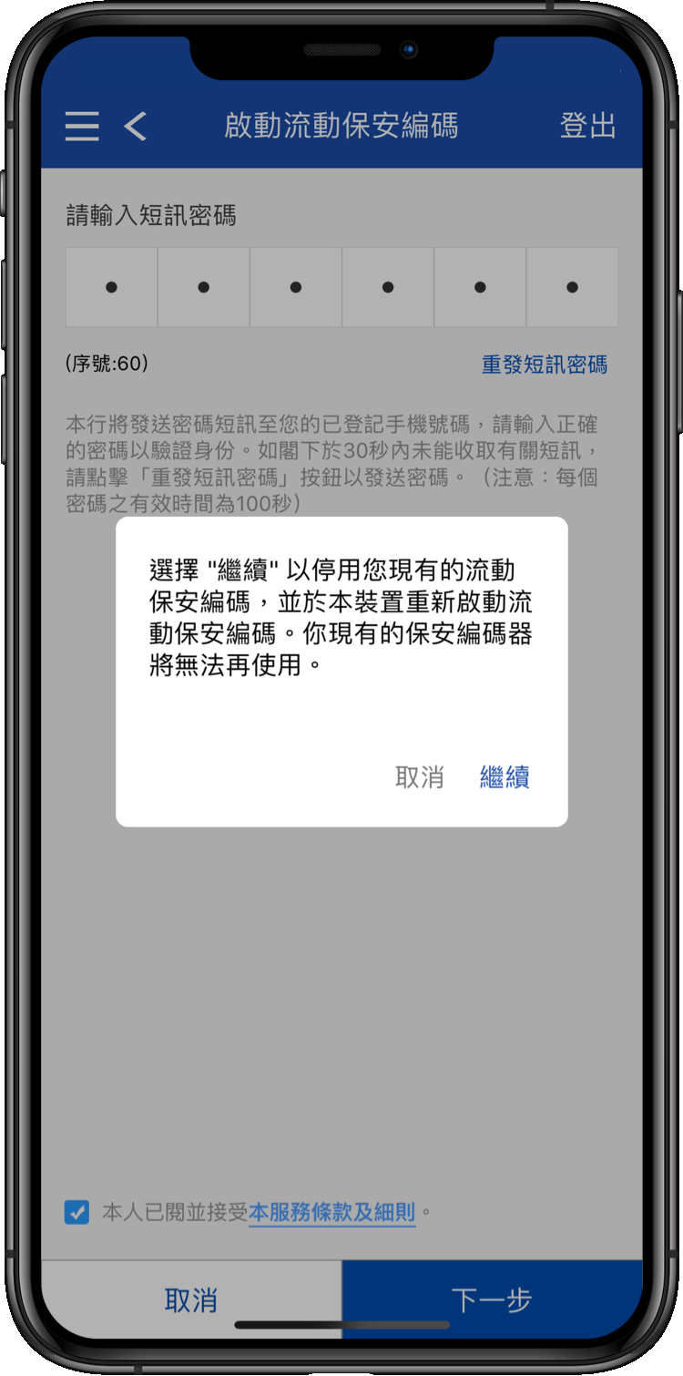 選擇「繼續」以停用您現有的流動保安編碼,並於新裝置重新啟動流動保安編碼。