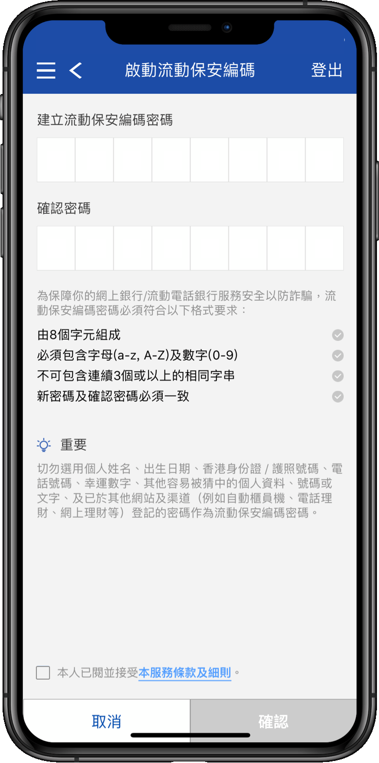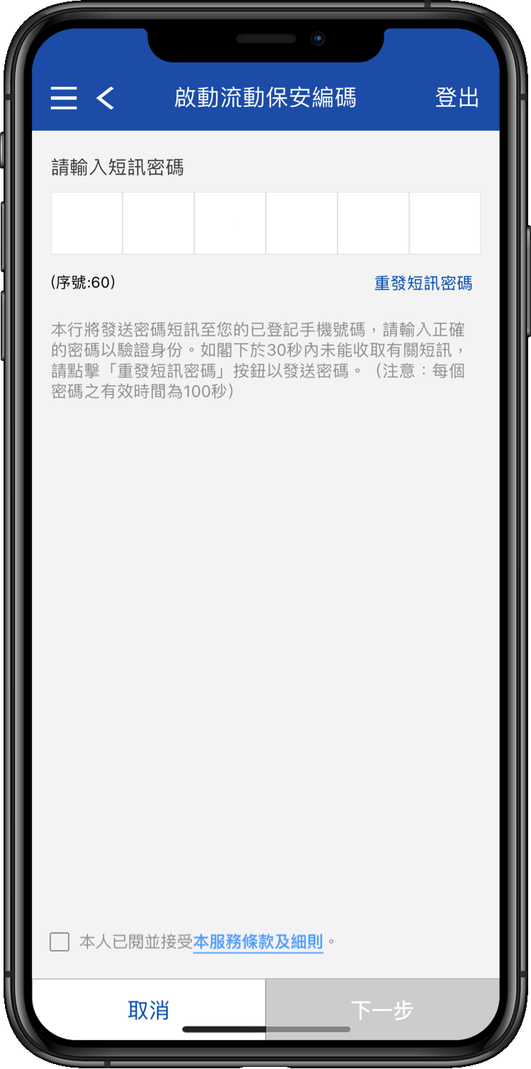 輸入「短訊密碼」作驗證,並確認條款及細則。
