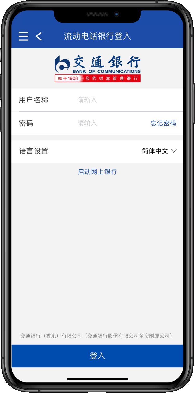 于新装置开启「交通银行(香港)」手机应用程式,以用户名称及密码登入。