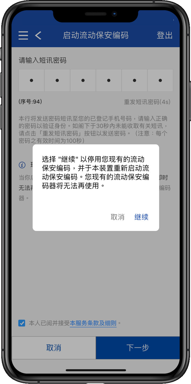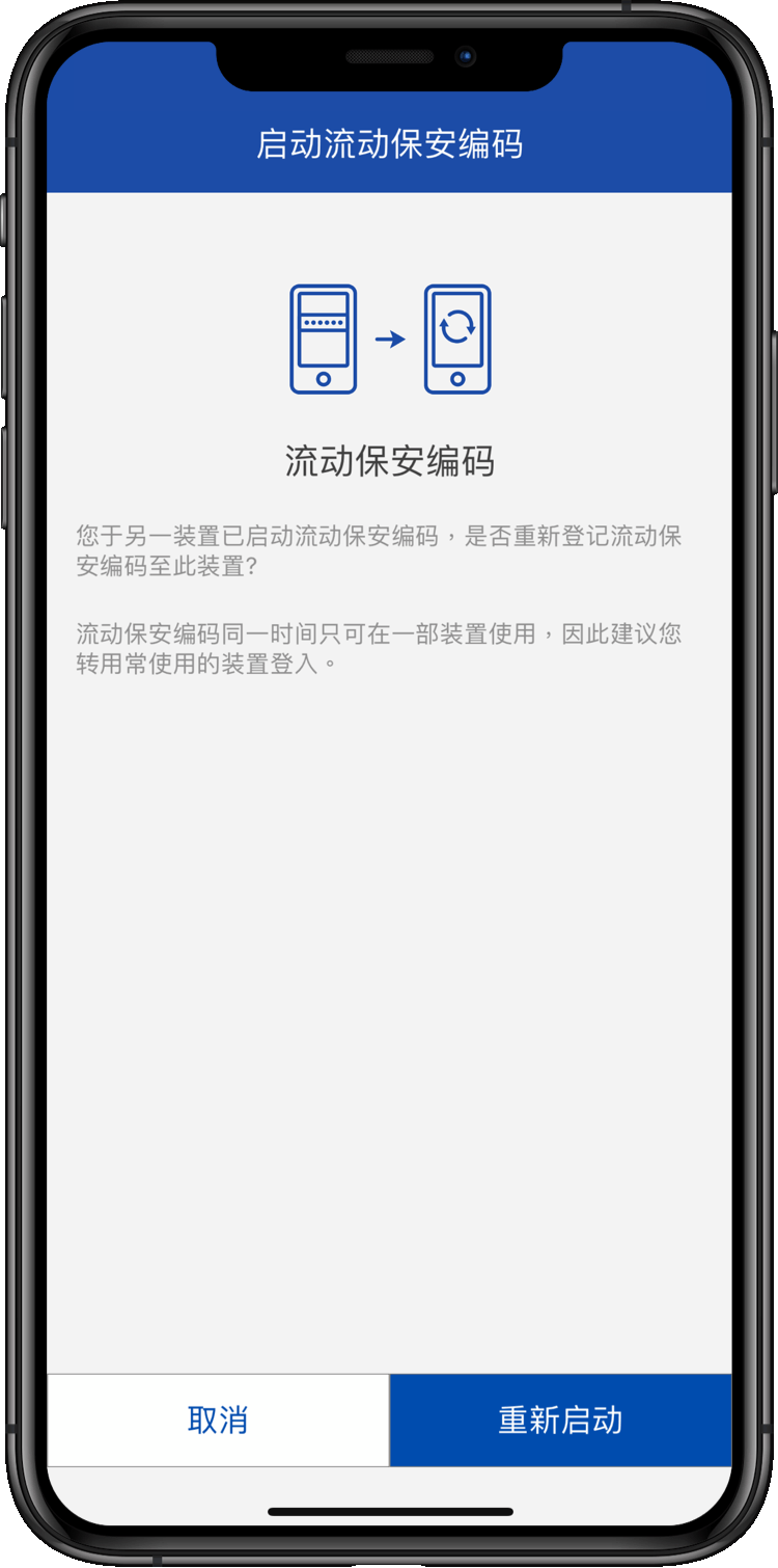 选择「继续」以停用您现有的流动保安编码,并于新装置重新启动流动保安编码。