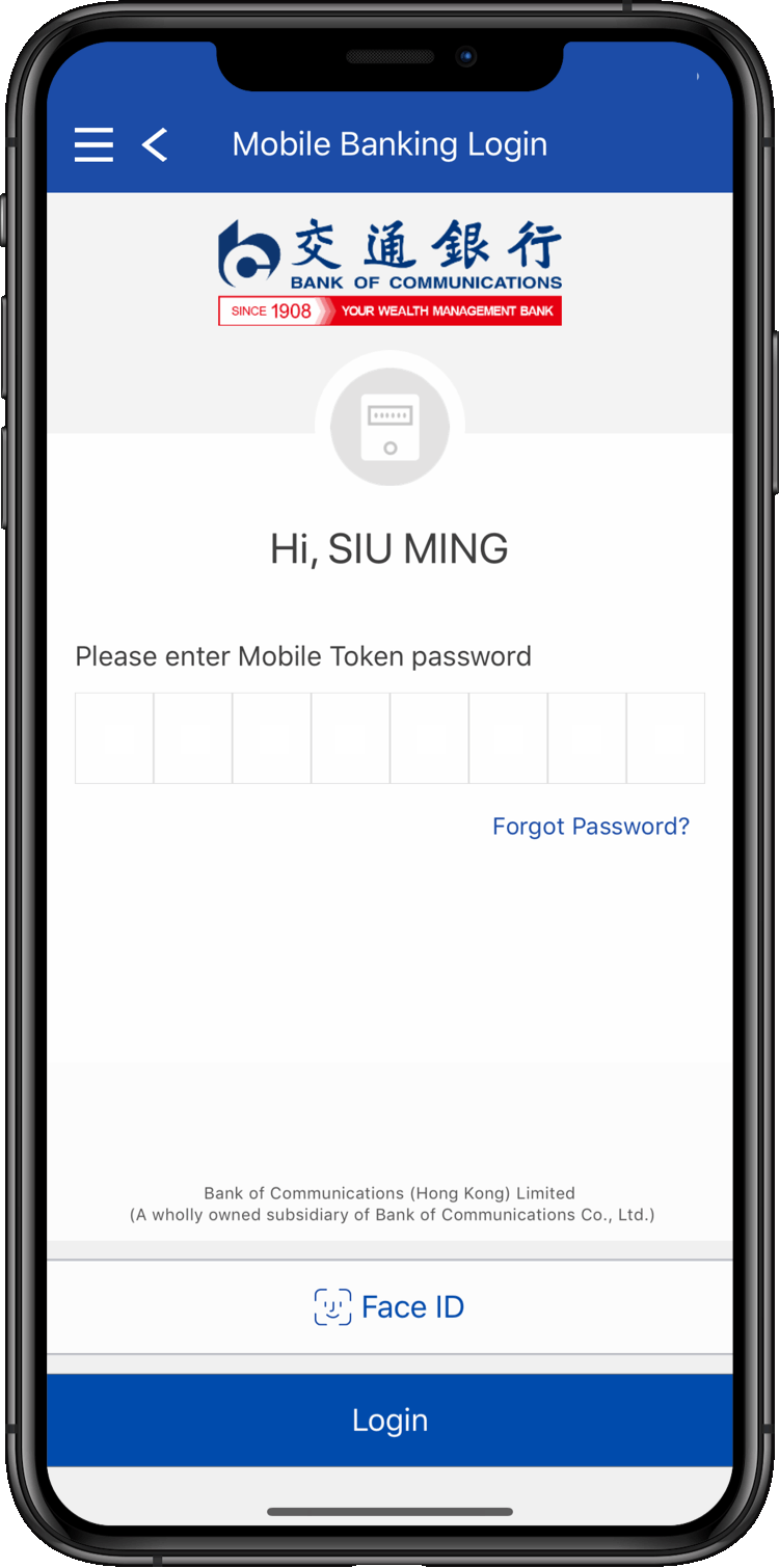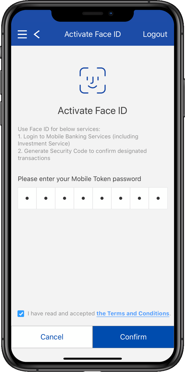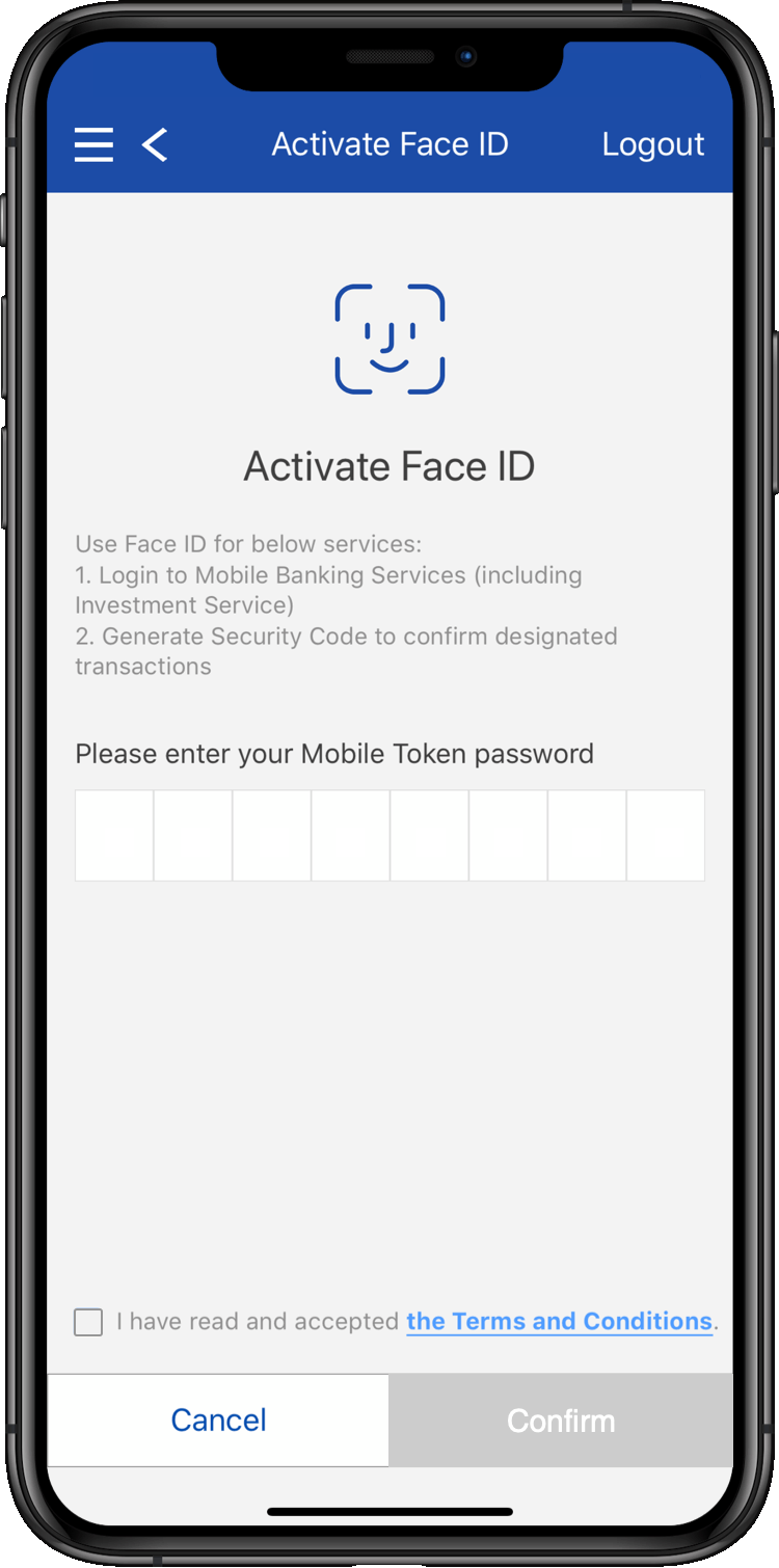 Input "Mobile Token Password" and click "Activate Face ID/Touch ID/Fingerprint Authentication" at Login Page.