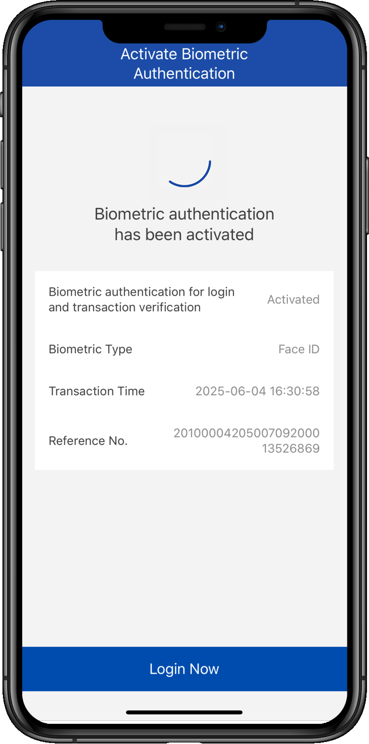 Biometric Authentication has been activated successfully. You can now log onto Mobile Banking Services or generate security code using Biometric Authentication.