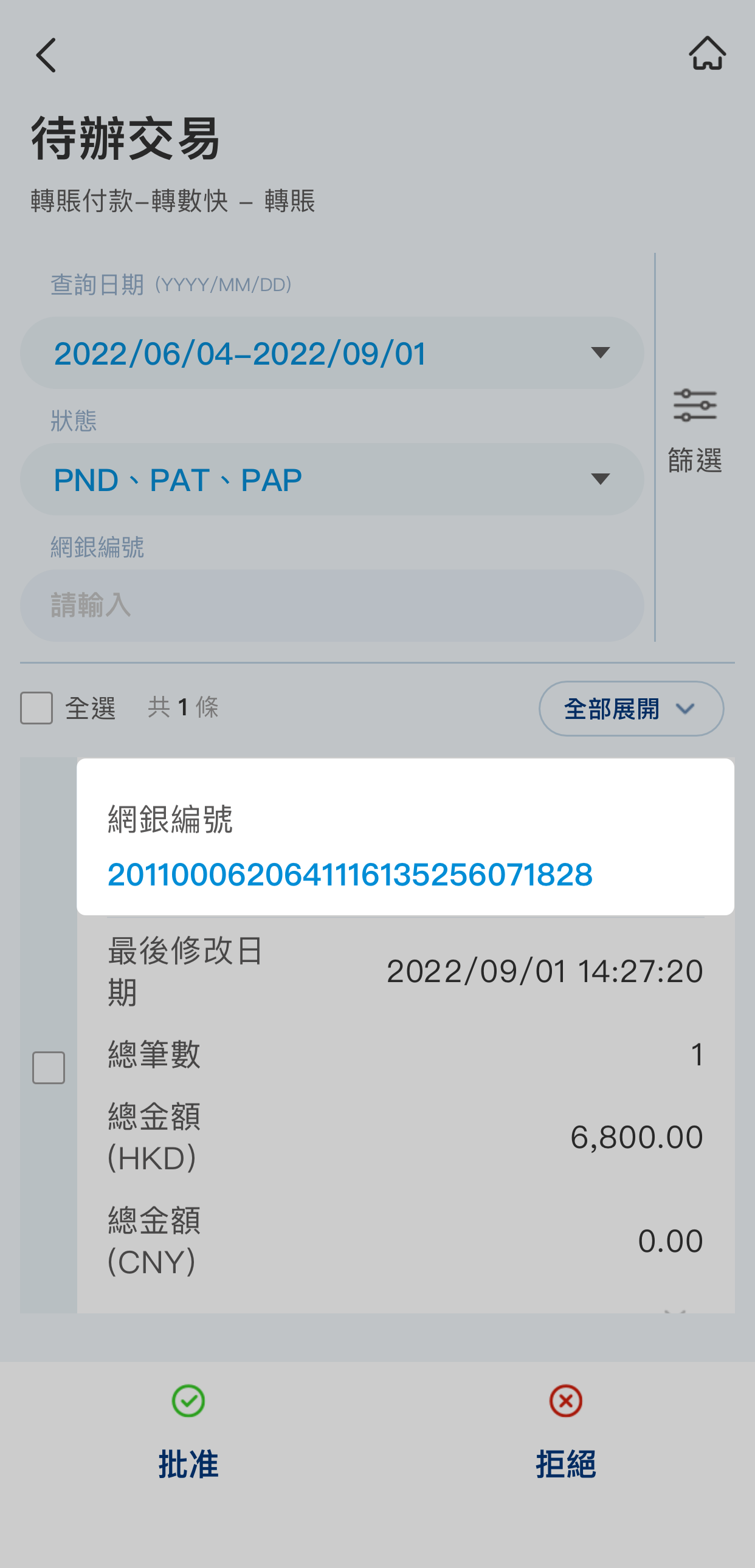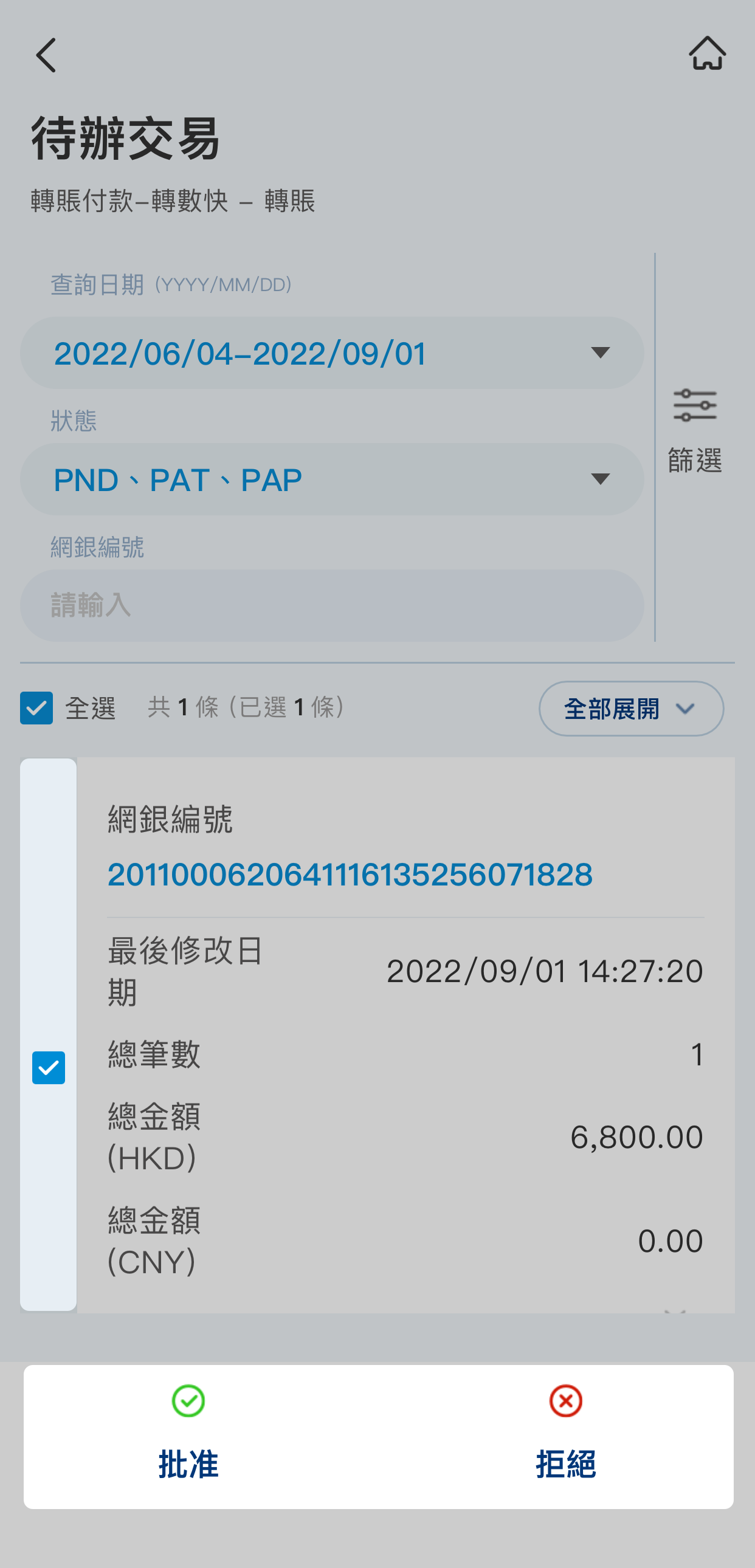閣下如需要一次進行多筆授權,可剔選所需授權交易,然後按「批准」或「拒絕」進行授權。
