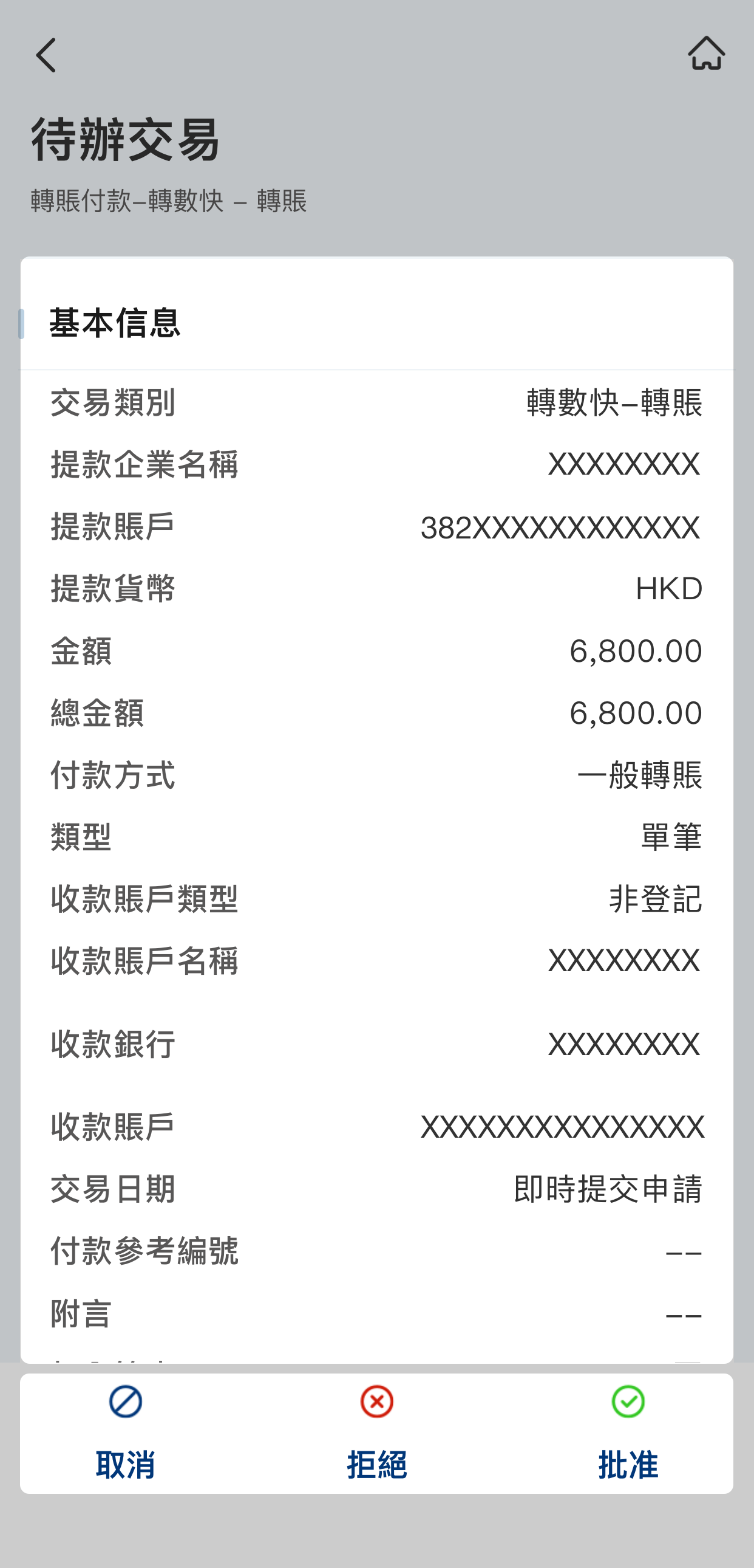 頁面顯示交易詳情內容,再按「批准」、「拒絕」或「取消」進行授權。