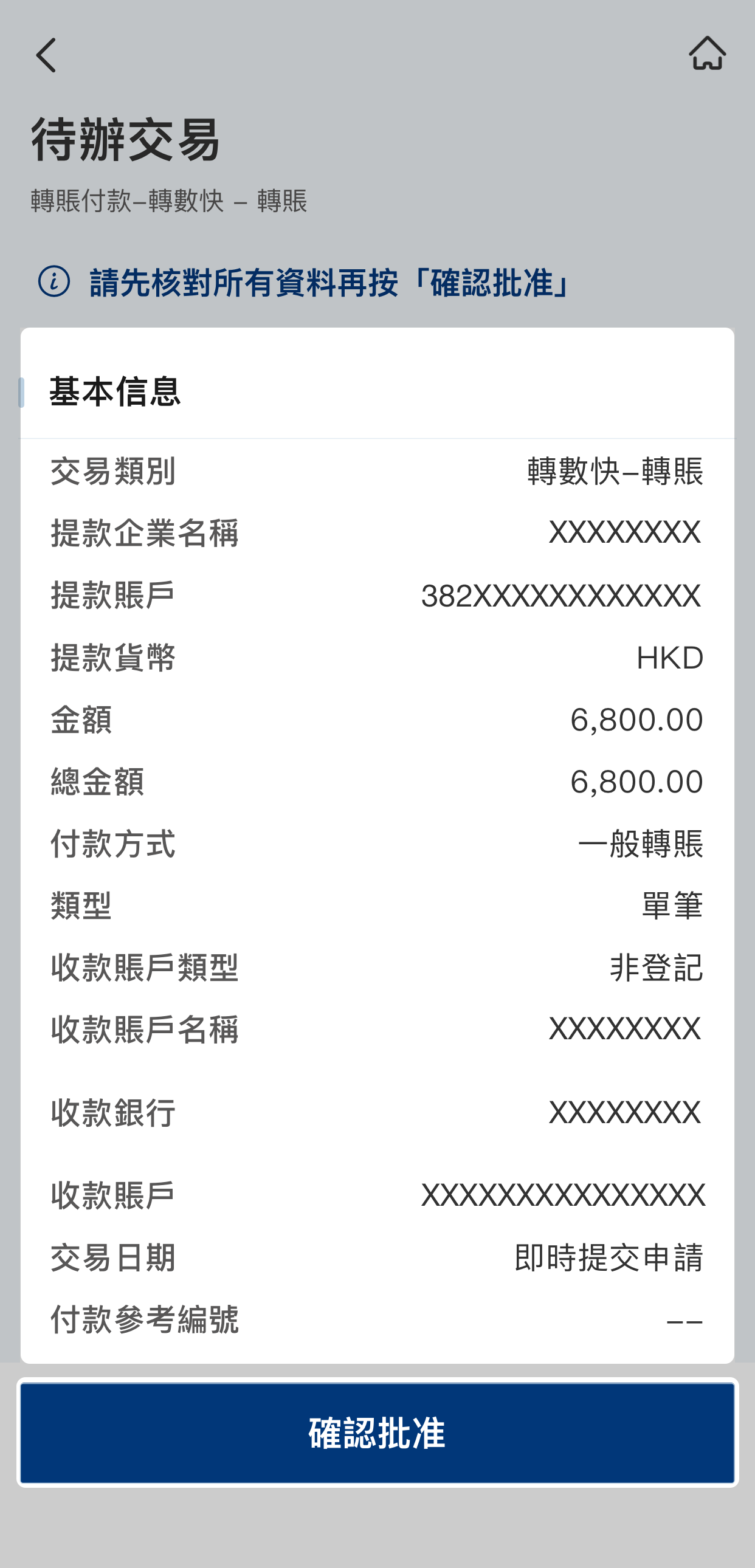 查看有關交易內容無誤後,請細閱並剔選有關條款及客戶聲明(如有),然後按「確認批准」繼續。