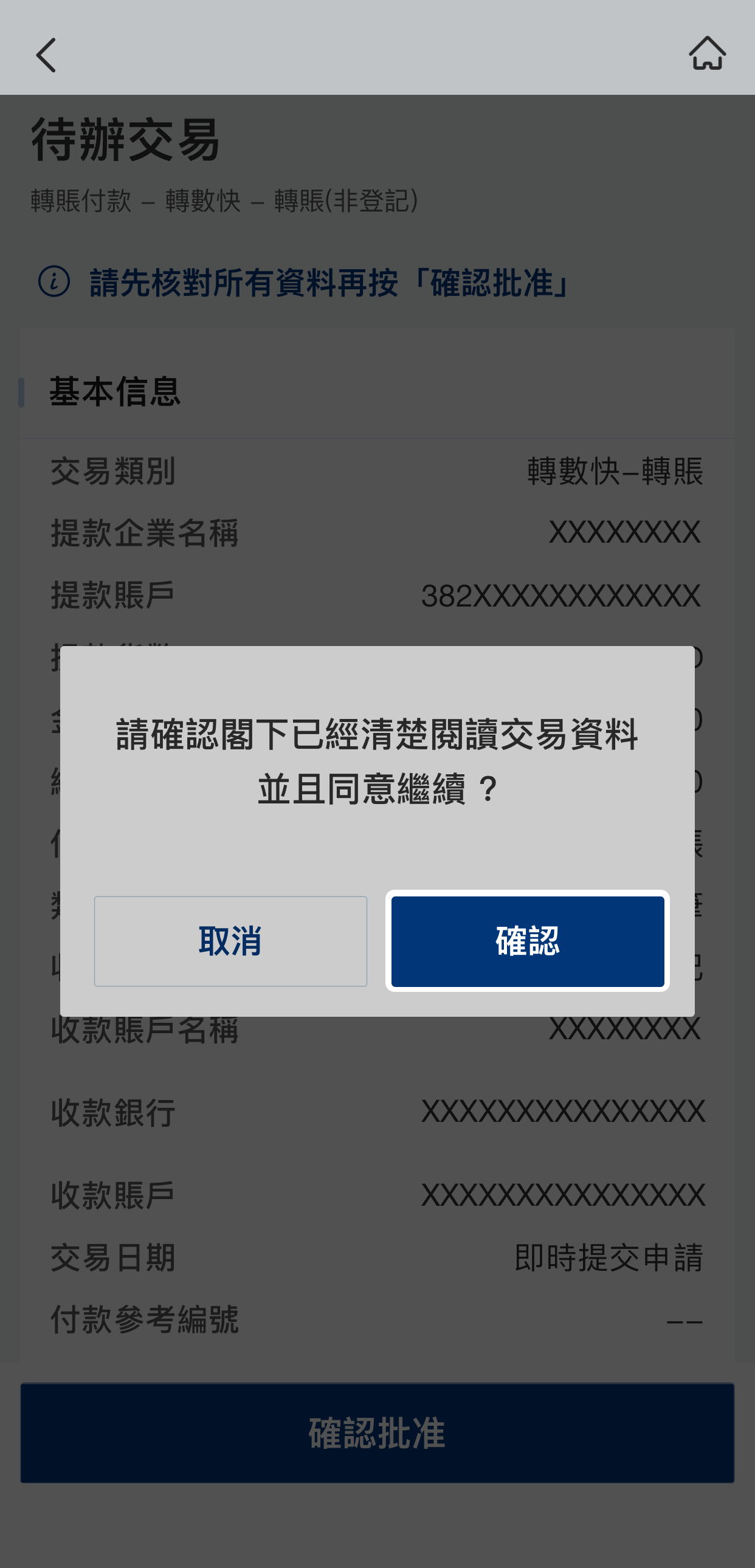 頁面彈出確認視窗,如確認交易資料正確無誤,按「確認」繼續。