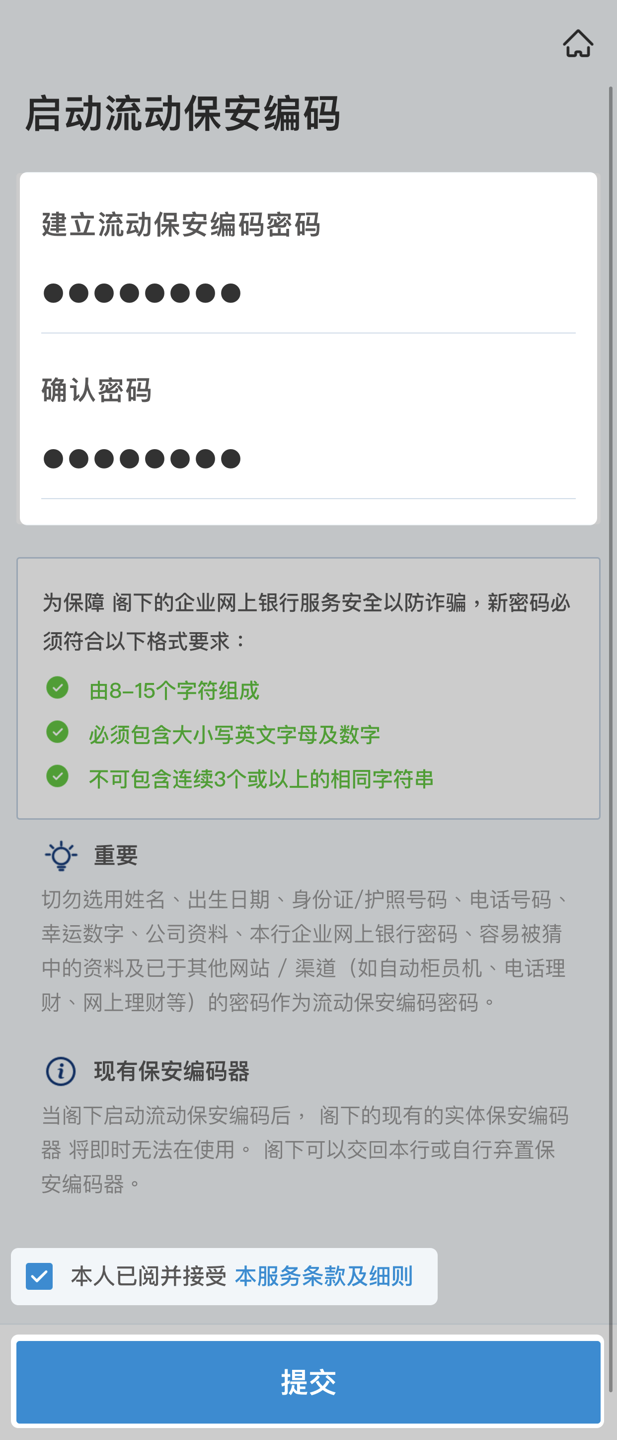 设立“流动保安编码密码”,确认条款及细则后,按“提交”。
