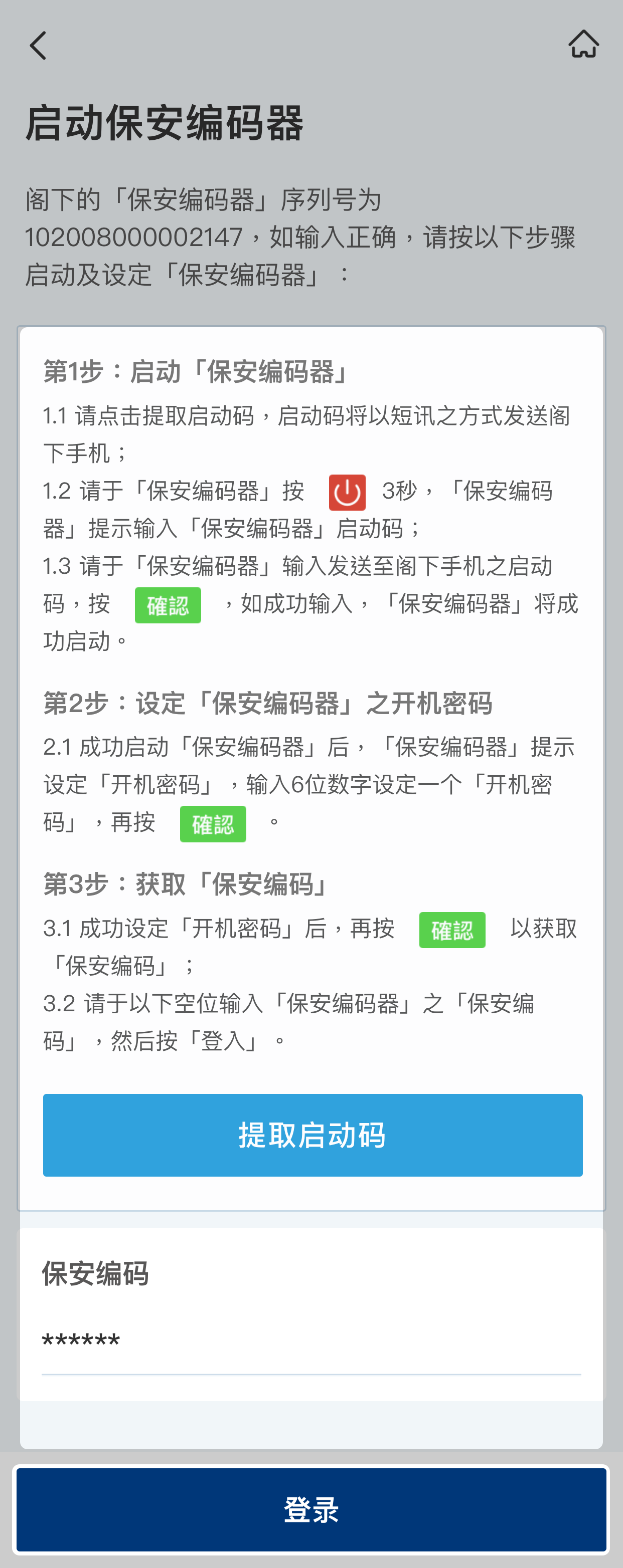 请确认保安编码器序列号正确,然后按“提取启动码”并根据页面指示启动及设定“保安编码器”。启动完成后,则可按“登录”。