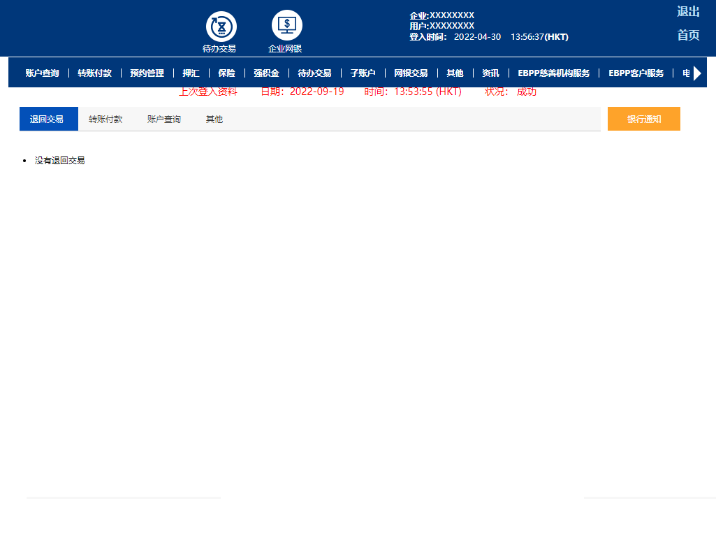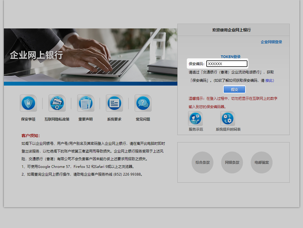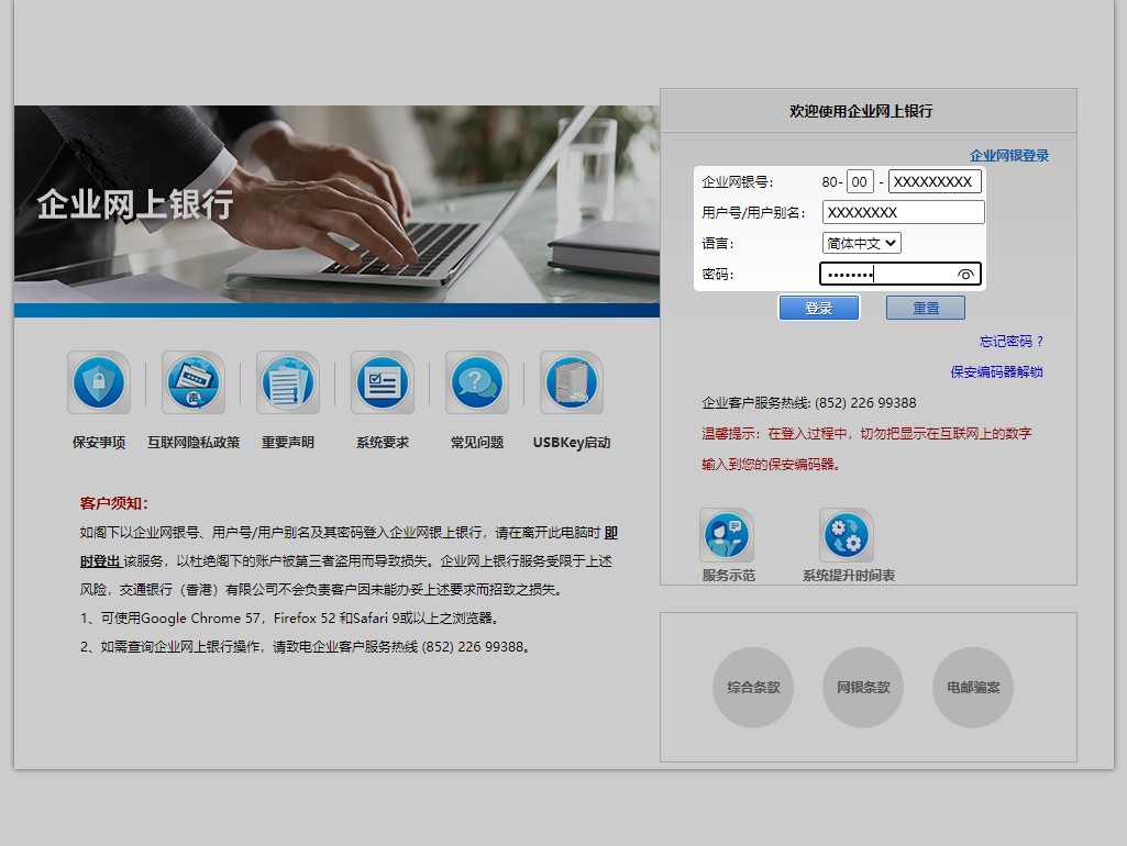於企业网上银行登入主页输入相关资料后按“登录”,便可启动网上银行服务。