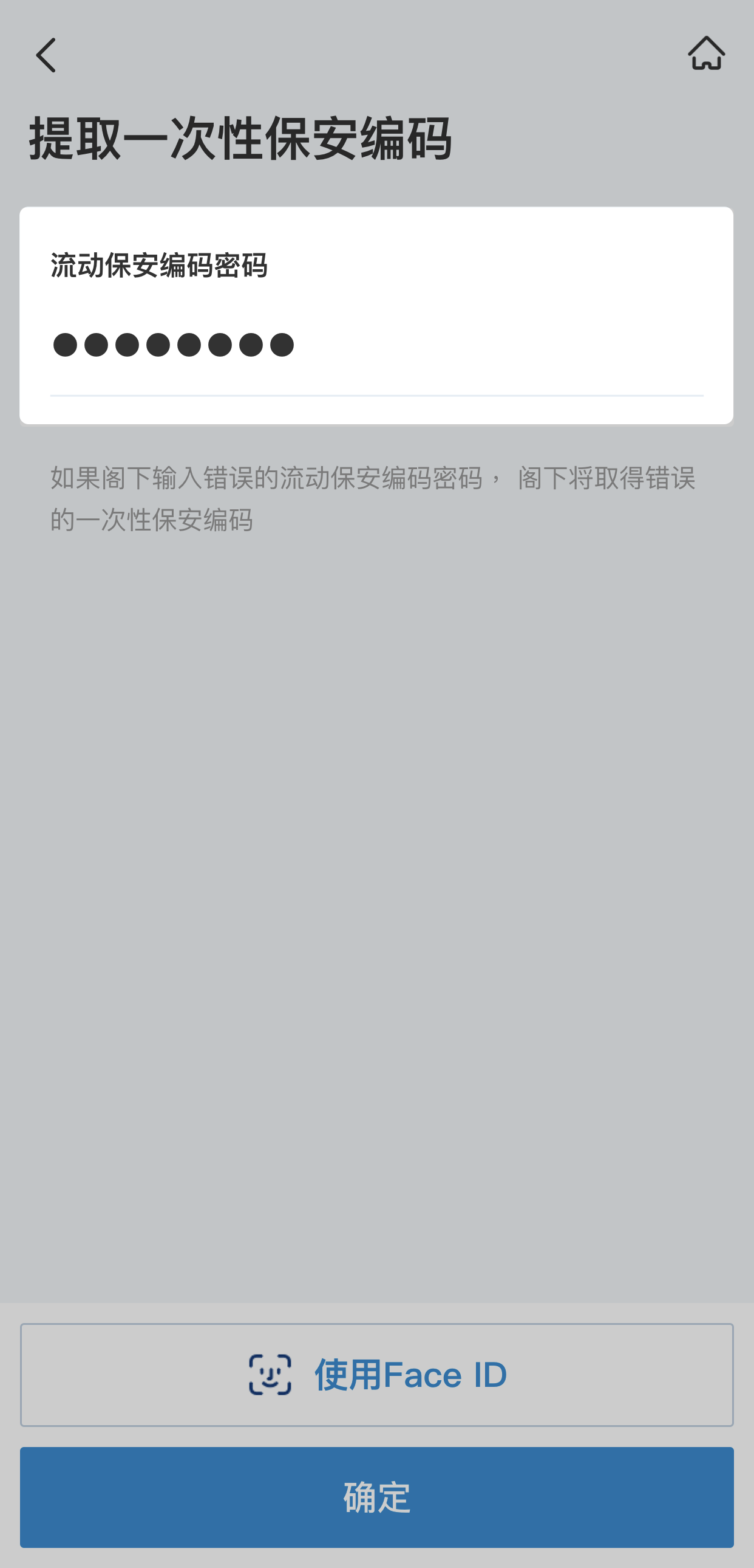 输入“流动保安编码密码”或使用“生物认证”,按“确认”。