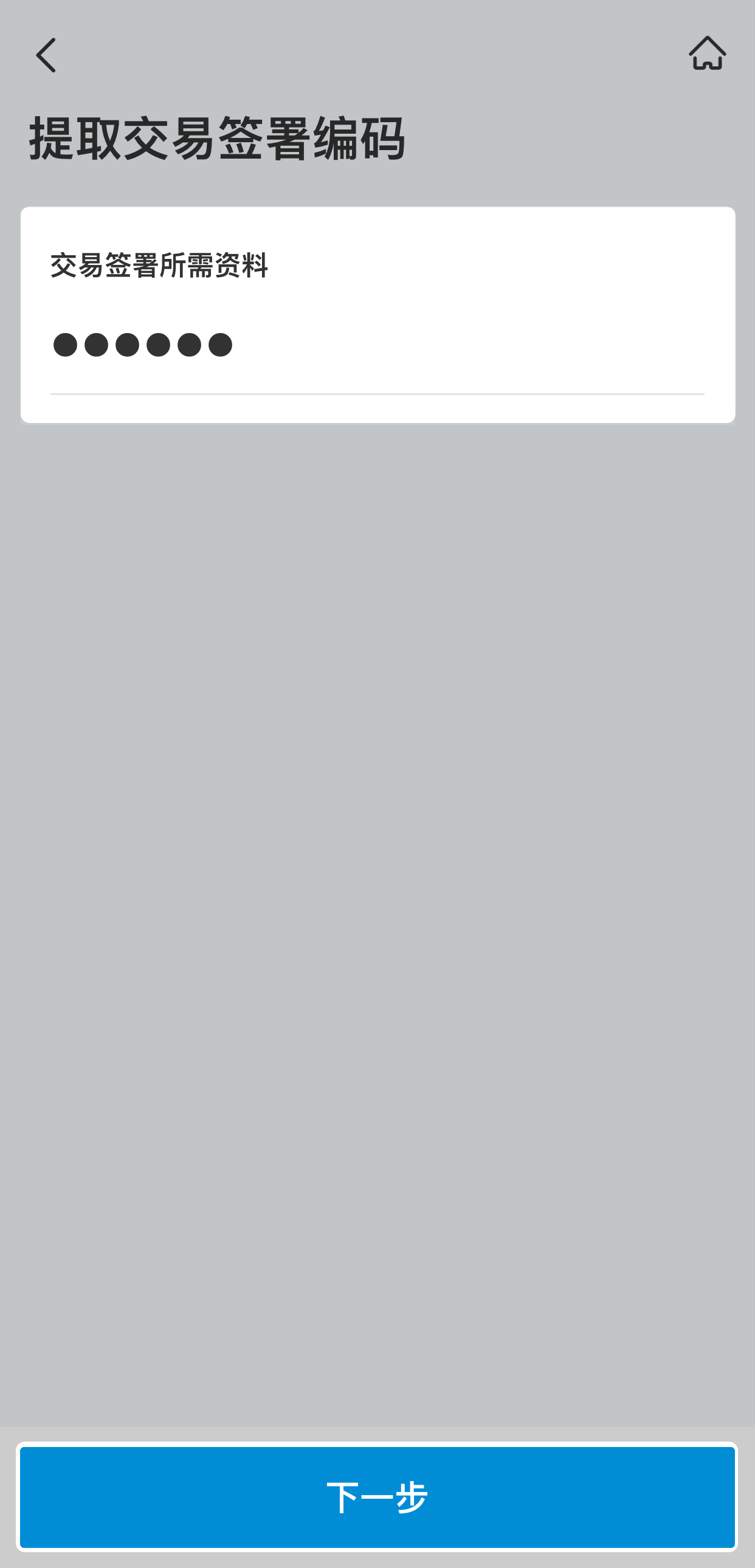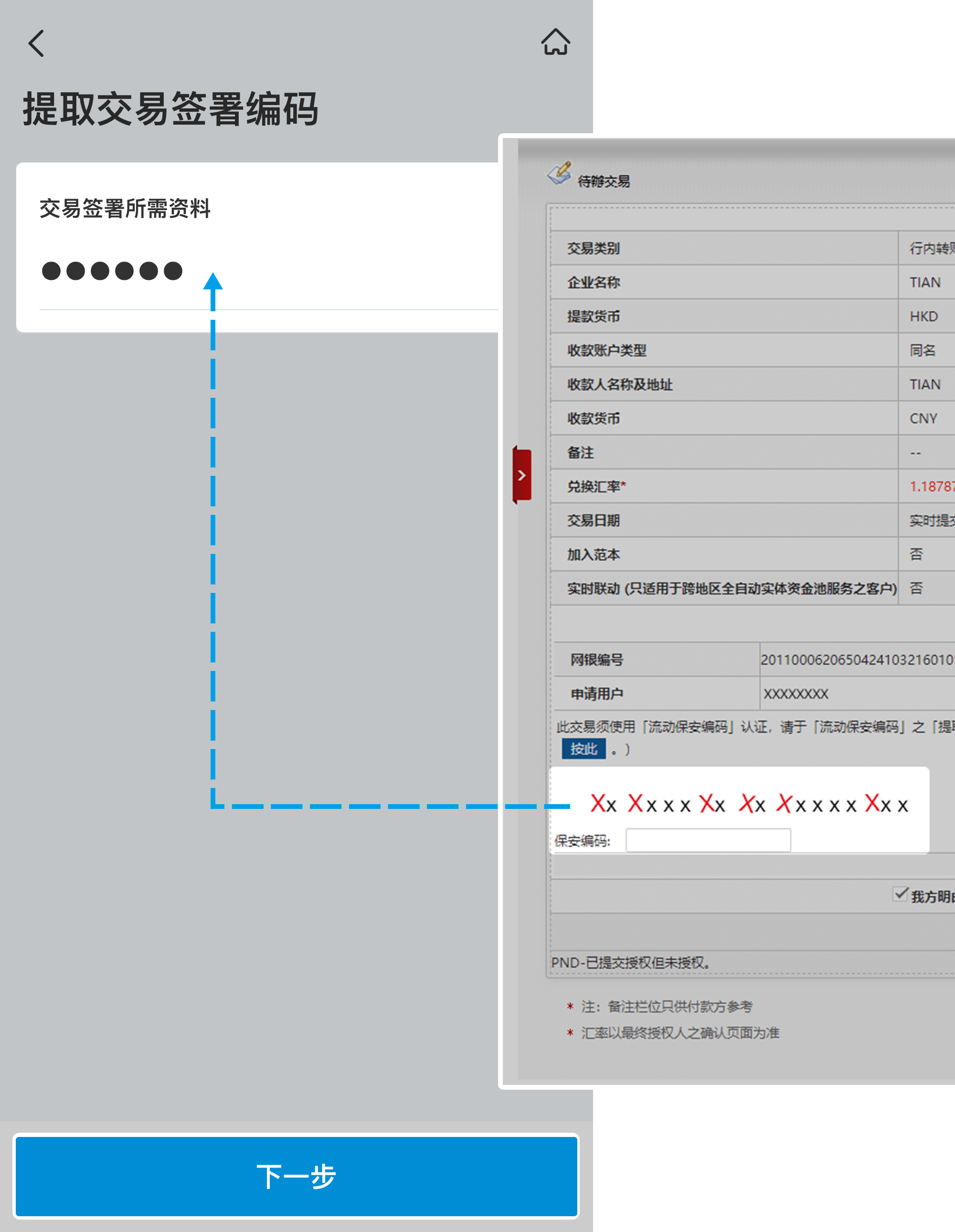在“交易签署所需资料”栏位输入在企业网上银行页面获取的6位红色数字,按“下一步”。