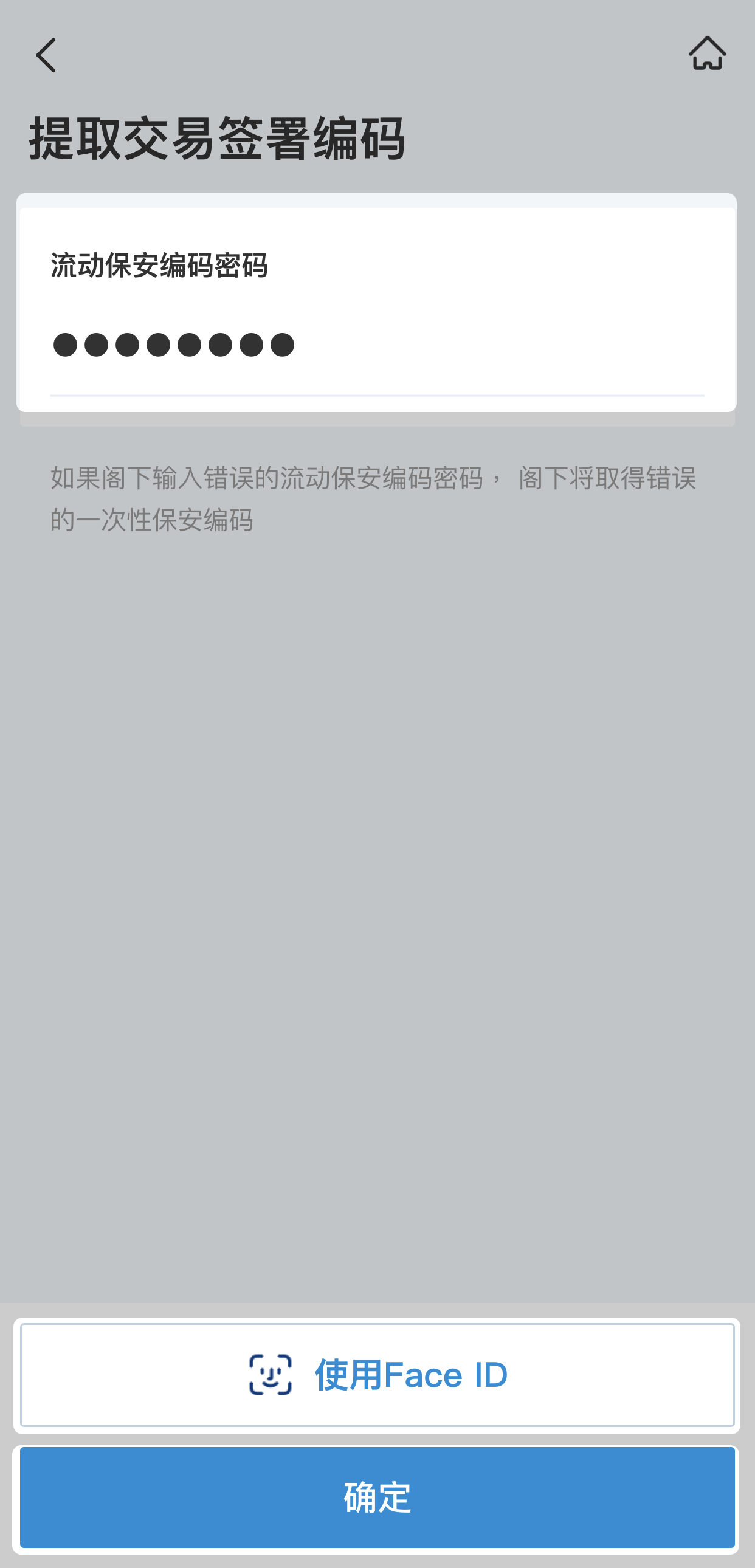 输入“流动保安编码密码”或使用“生物认证”,按“确认”。