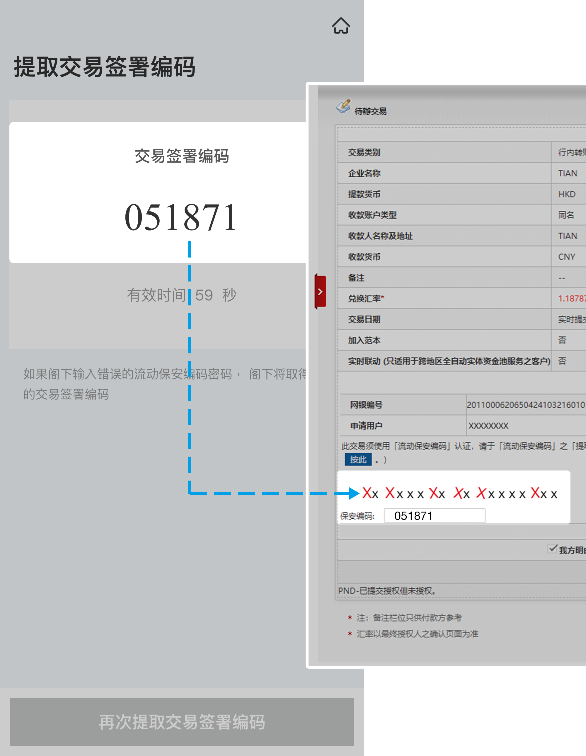 指定企业网上银行交易需进行“交易签署”验证,验证需要的功能输入资料(红色数字)可在企业网上银行页面获取。
