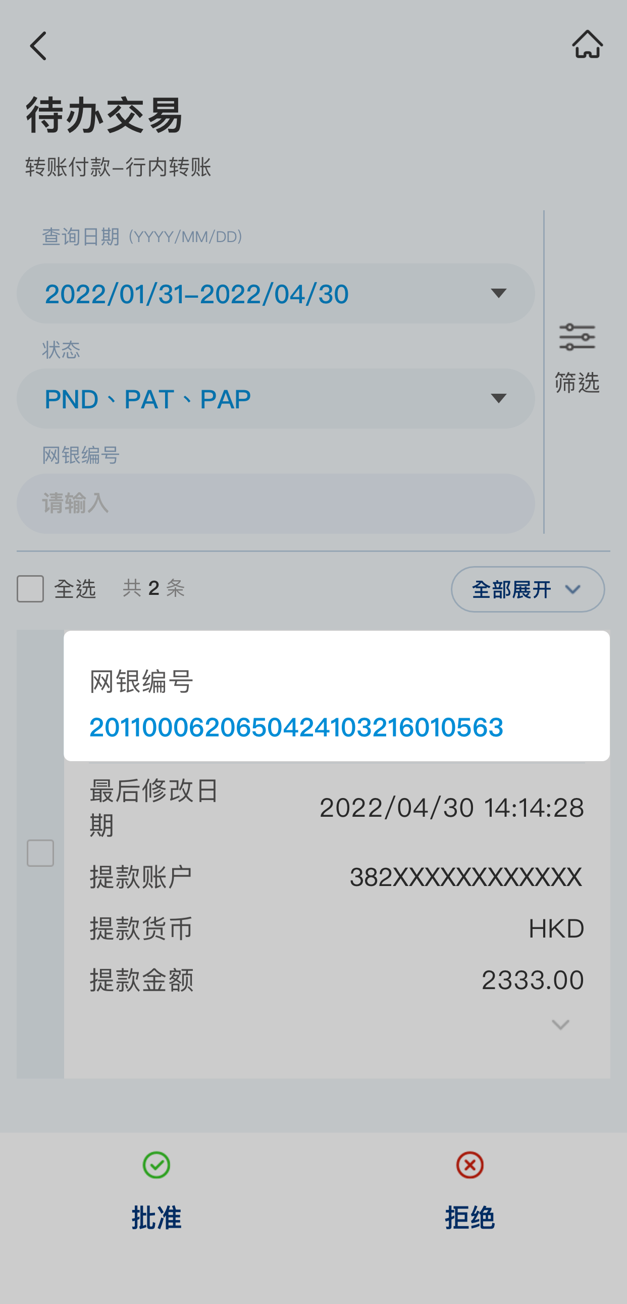 阁下如需要一次进行多笔授权,可剔选所需授权交易,然后按“批准”或“拒绝”进行授权。