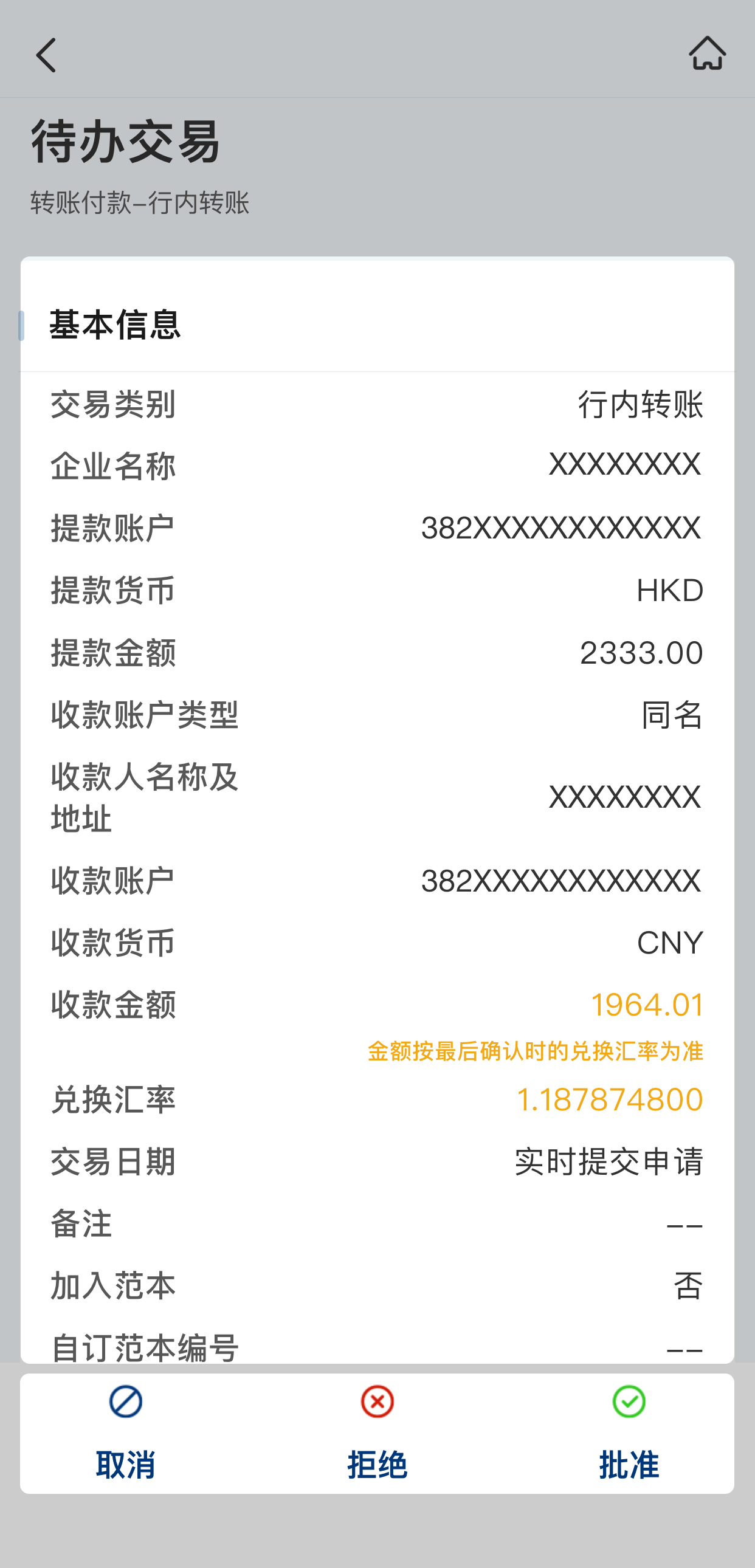 页面显示交易详情内容,再按“批准”、“拒绝”或“取消”进行授权。