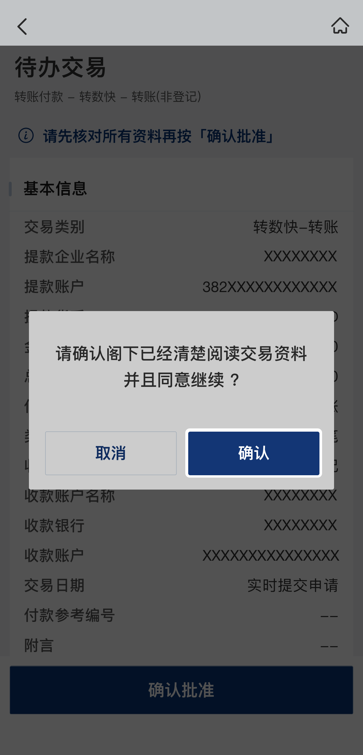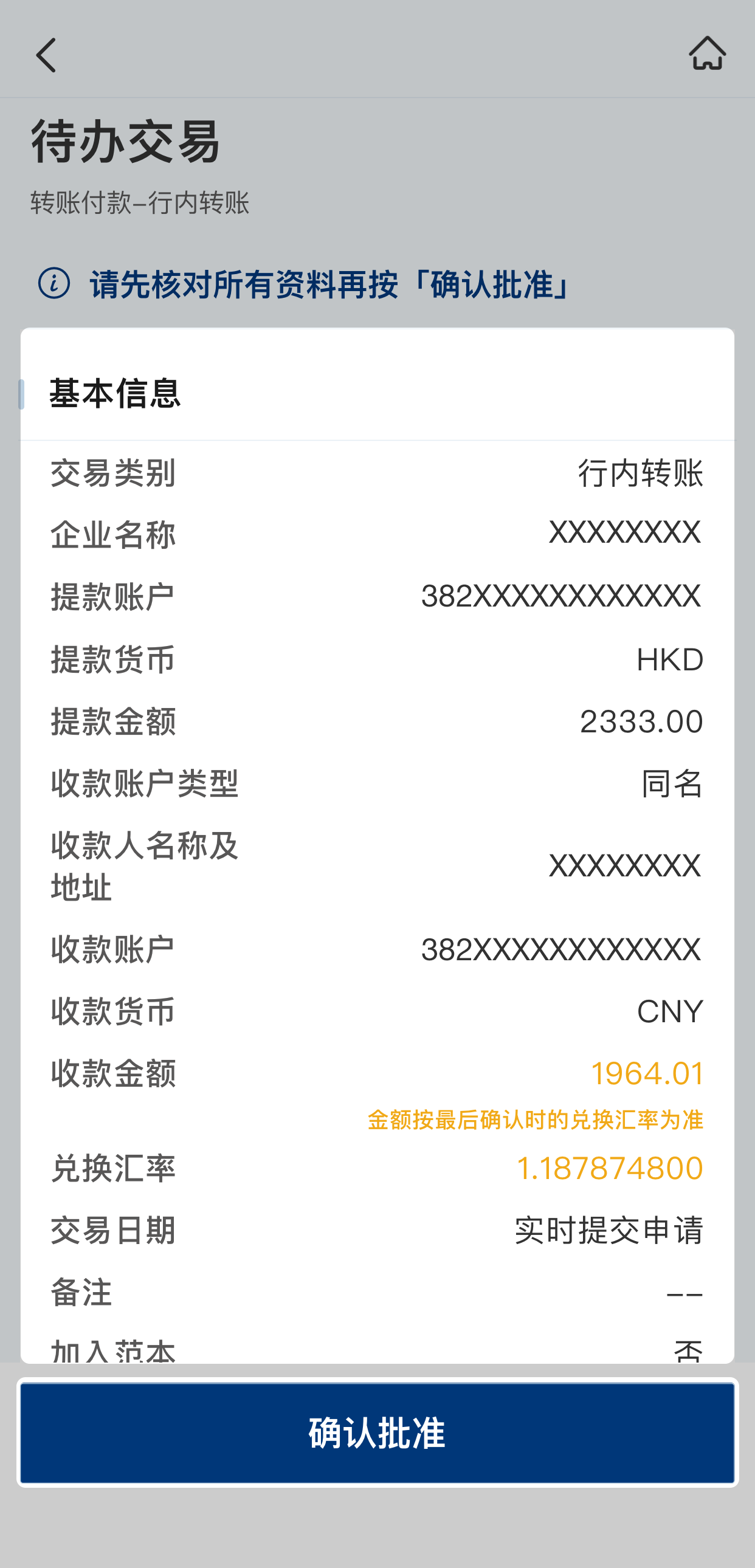 查看有关交易内容无误后,请细阅并剔选有关条款及客户声明(如有),然后按“确认批准”继续。