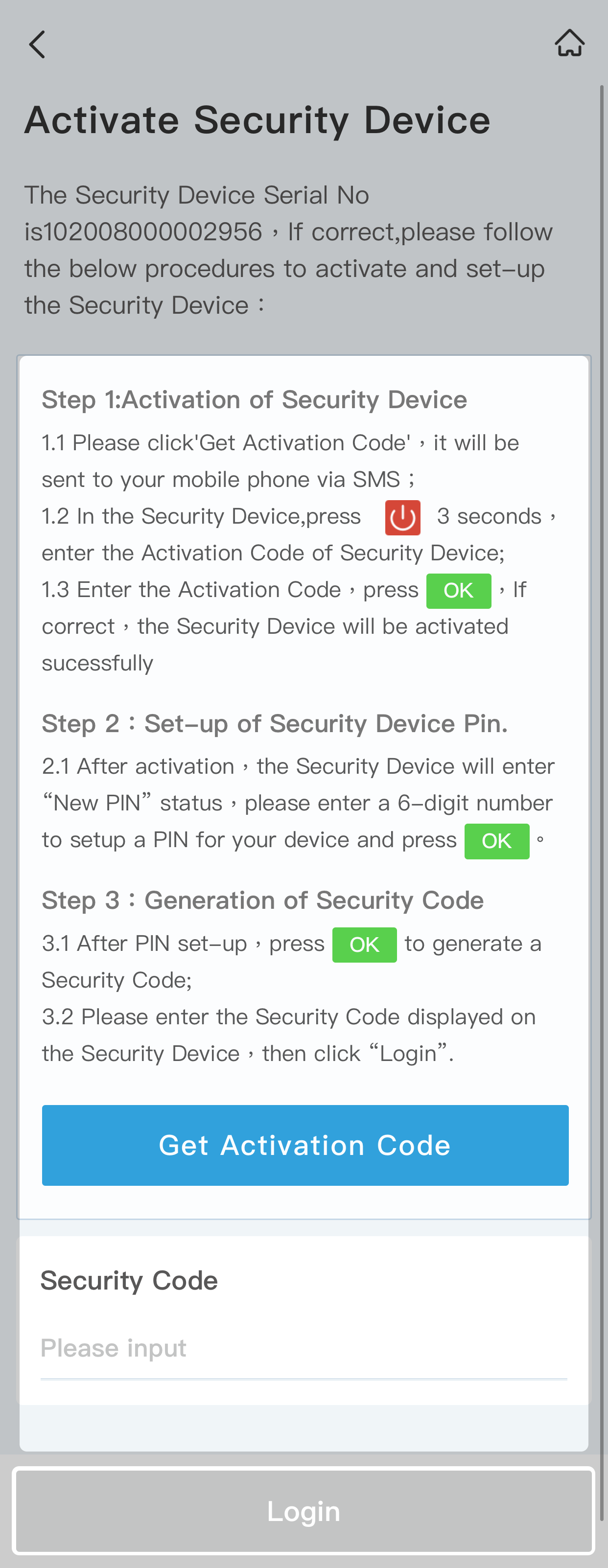 Please confirm the Security Device Serial No., then press "Get Activation Code" and follow the instructions on the page to activate and set up "Security Device". After the activation was completed, press "Login"。
